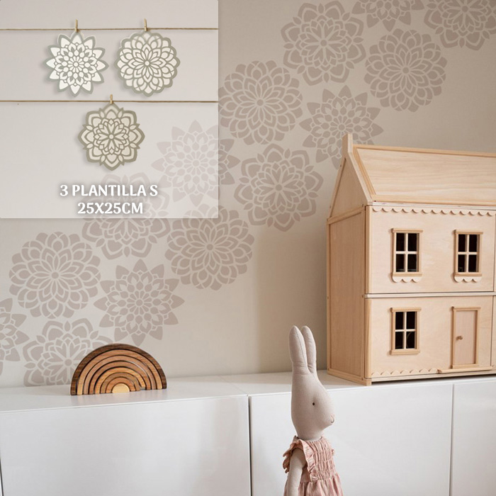 Modo de uso: Pega la plantilla con cinta adhesiva a la superficie que se va a decorar, para manualidades o espacios interiores utiliza pintura acrílica o a base de agua y para espacios exteriores o pisos utiliza pintura a base de aceite o aerosol. Para pintar utiliza un rodillo pequeño de espuma y poca pintura o también puedes utilizar un pincel redondo grueso (numero 9 o numero 12) dando golpes en la superficie, retira la plantilla y listo, haz creado una obra de arte! Tenemos mucho más explicado este proceso en la página de Uso de las plantillas en el menú principal y recuerda escribirnos en nuestra línea de atención de Whatsapp si tienes algúna inquietud o necesitas asesoría.