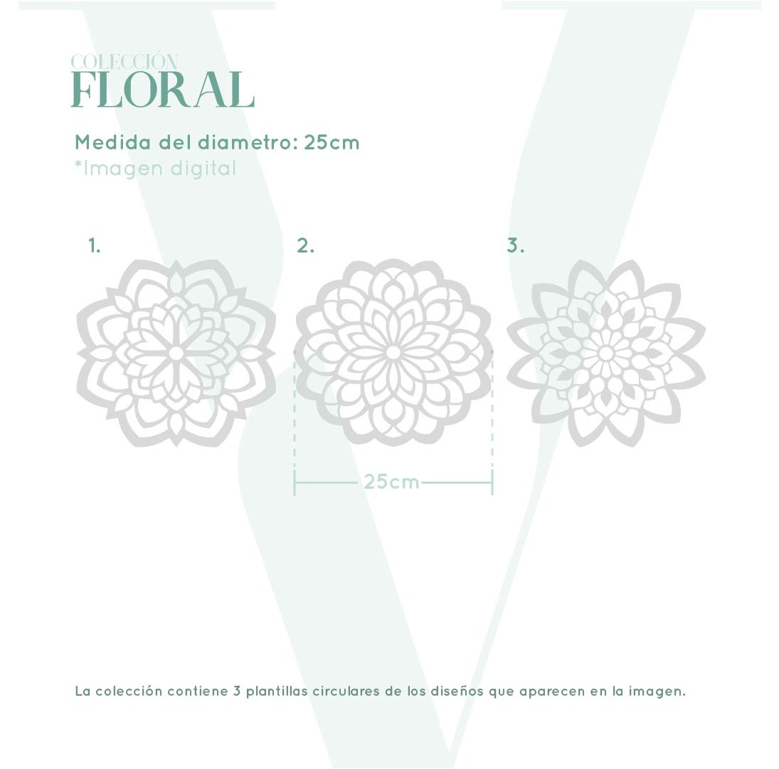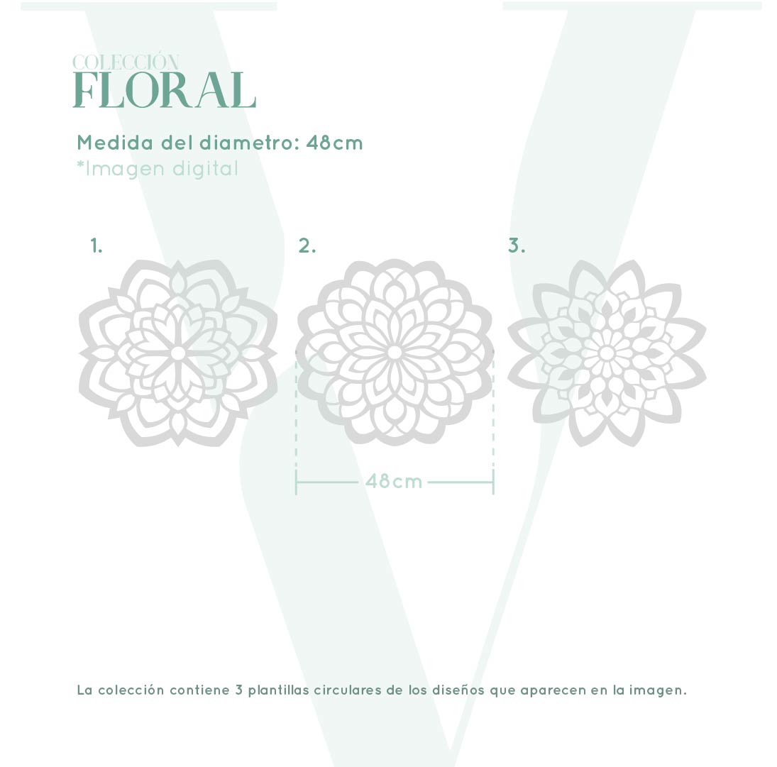 La colección Floral cuenta con 3 diseños diferentes que terminan en la forma del diseño de la misma, permitiendo así crear patrones más divertidos. También termina con una margen de 1cm para facilitar la manipulación de la misma. Esta colección viene en una presentación de 25cm de diámetro y de 48cm de diámetro. Son reutilizables y sirven sobre cualquier superficie, como en paredes, pisos, madera, tela, vidrio, lienzo y demás.