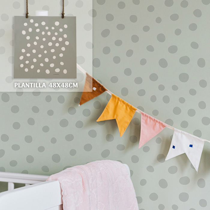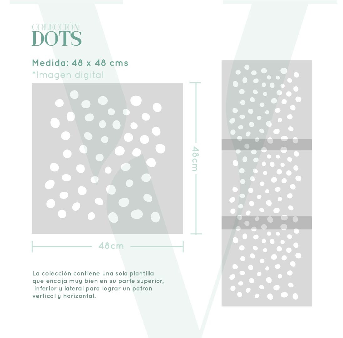La colección Dots cuenta con una plantilla en presentación de 48cm de alto por 48cm de ancho. Cuenta con una sola plantilla que encaja en su parte superior, inferior y lateral para lograr un patrón vertical y horizontal. Es reutilizable y sirve sobre cualquier superficie, como en paredes, pisos, madera, tela, vidrio, lienzo y demás.